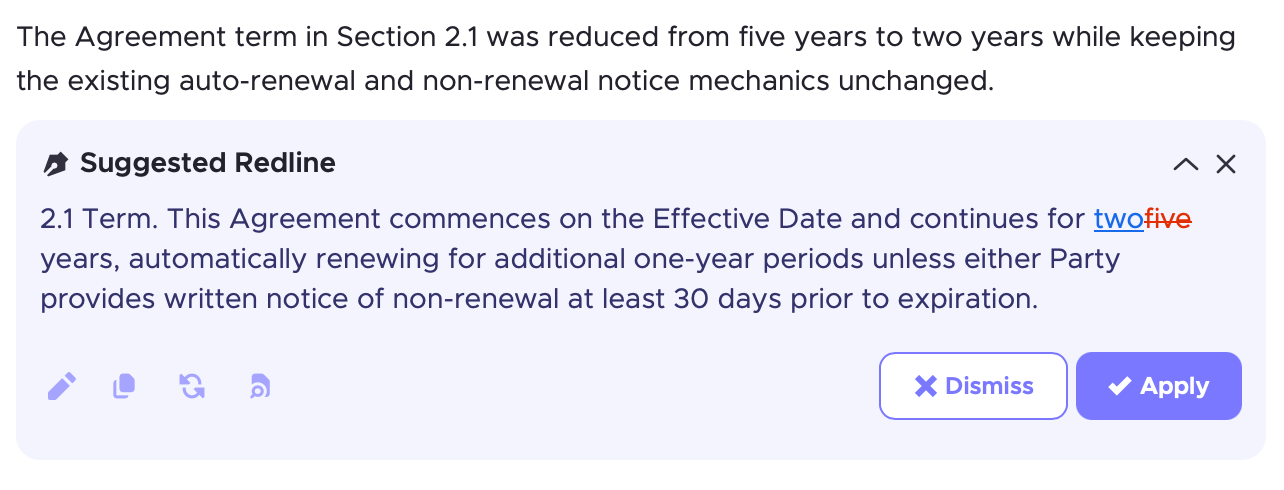 This happens every time you use any of the four actions, whether you're asking a question, redlining a clause, drafting new language, or comparing two versions.